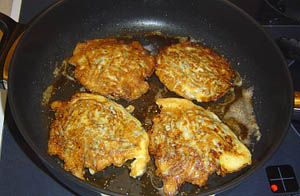 Heat a frying pan. Add butter and fry ¼ cup of mixture at a time, turning to brown both sides. Place on kitchen paper to drain. (Makes five.)