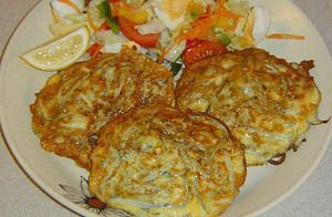 Coat a frying pan with oil or butter (clarified is best) and spoon generous helpings of the mixture into the pan. Flip the fritter when it is beginning to brown-but be careful not to overcook or the fritter can become tough. Squeeze a little lemon juice on the fritter while it is still in the pan-just before it is finished.